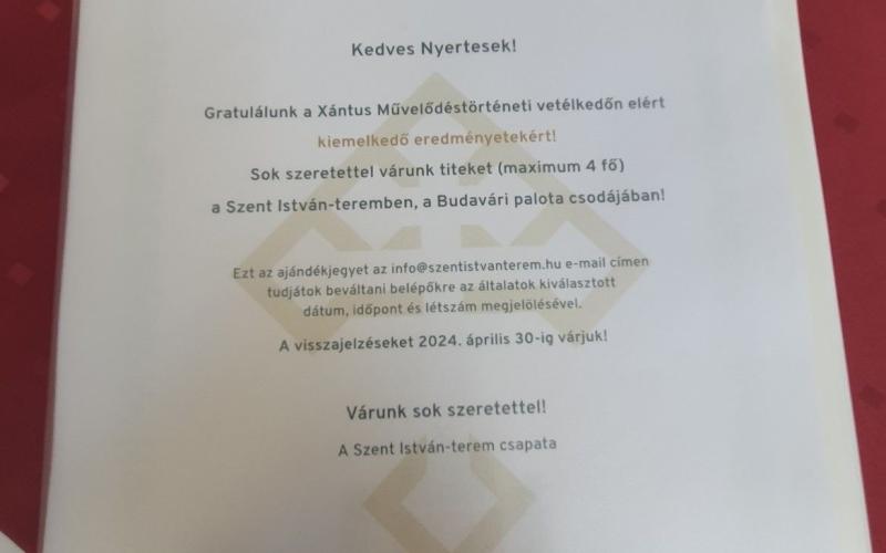 Az idei tanévbe is a Művészetek Hete programsorozat részeként került megrendezésre Szent Korona témakörben a Xántus Művelődéstörténeti vetélkedő szóbeli döntője. A nagy érdeklődéssel várt megmérettetés során a döntőbe jutott 5 csapat, egy előzetesen kisorsolt témakörben adta elő 15-20 perces színes prezentációját. A színvonalas verseny győztese a 11. B osztály négy fős csapata lett, akik a koronázási jelképek történetéből mutattak be nagy tetszést arató előadást. A döntőbe jutott csapatok mindegyike értékes nyereményekkel gazdagodott, melyekért szeretnénk köszönetet mondani a Szent István Kávéház, a Várkapitányság nonprofit Zrt., valamint a szülői közösség tagjainak.
