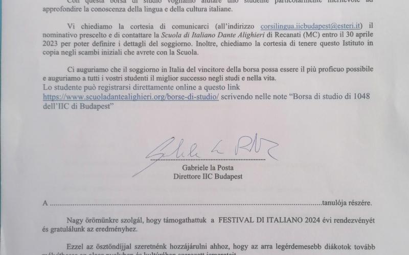 Az egyéni és a csoportos díjak mellett iskolánk elnyerte a Budapesti Olasz Kultúrintézet nagydíját is, mely egy kéthetes olaszországi ösztöndíj 1048 euró értékben. A díjat iskolánk képviseletében Herczeg Enikő és Kocsis Gréta szaktanárok vették át Gabriele La Posta Intézetigazgató Úrtól.