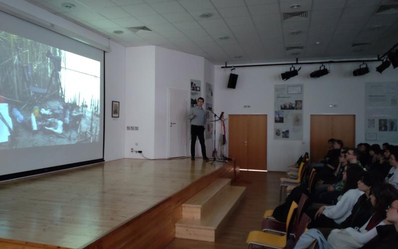 Mesélt a világ legegzotikusabb pontjain, pl. Pápua-Új-Guineán és Ugandában szerzett élményeiről, bemutatott saját készítésű videókat és lélegzetelállító festményeket nálunk kevéssé ismert fajokról, valamint fényképek segítségével összefoglalta, hogyan zajlik egy expedíció. Nagy sikert aratott a diákok körében a sok izgalmas történet és kalandos útleírás. Érdeklődéssel hallgatták hogyan sikerült egy hópárduc nőstényről és két kölykéről felvételt készíteni, és miként lépett a lábára felvétel közben egy ezüsthátú gorilla. A tanulók megcsodálhatták egzotikus állatok hangját, és láthatták, miként "udvarolnak" a madarak táncukkal és hangjukkal.