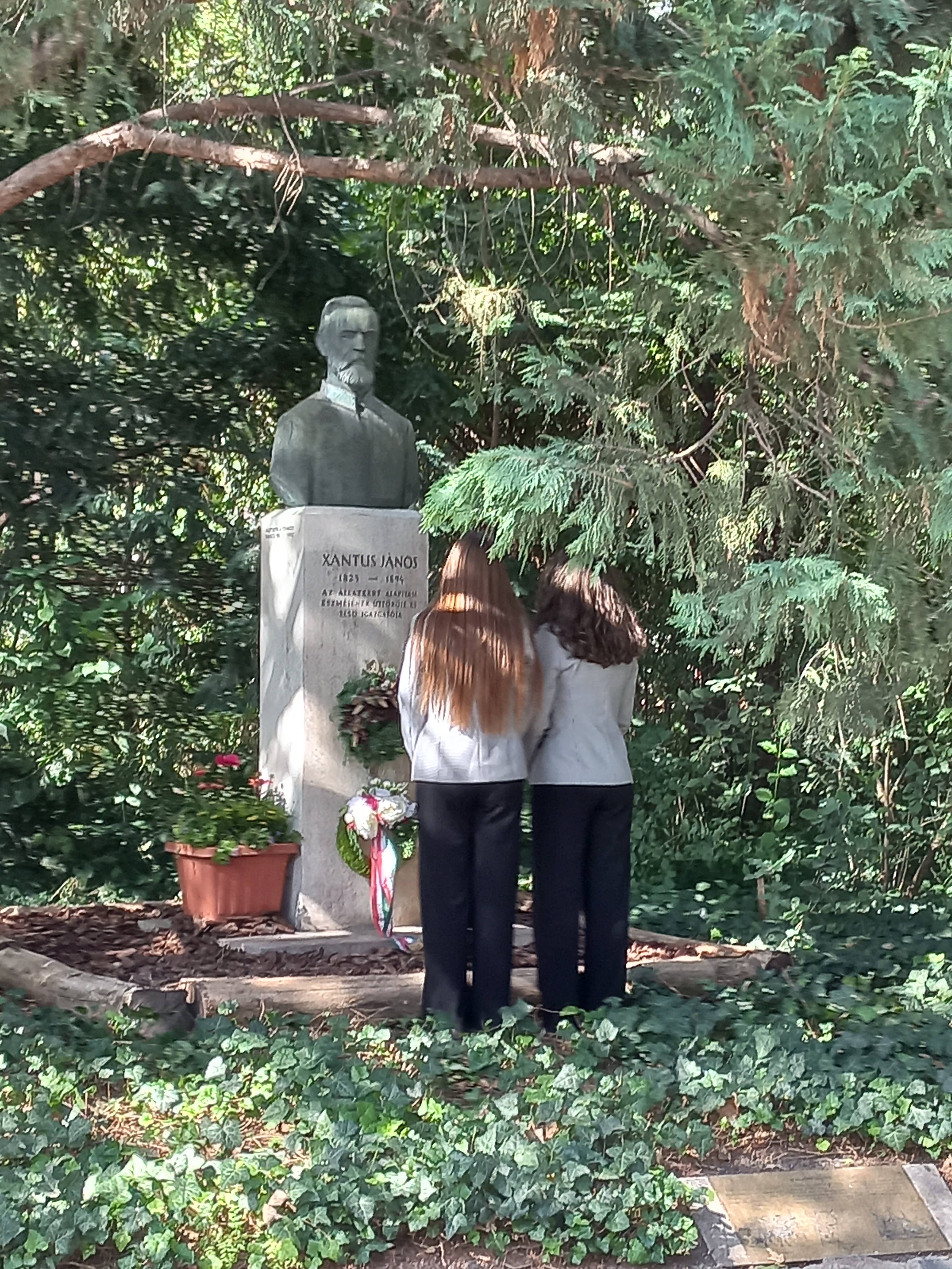 A Nemzeti Sírkertben Xántus síremlékénél megható és tartalmas emlékünnepélyen képviselték iskolánkat diákönkormányzatunk tagjai Hernády Betti Tanárnő kíséretében. A magas rangú ceremónián a Nemzeti Örökség Intézetének kulturális igazgatója, a Néprajzi Múzeum főmuzeológusa és a Budapesti Állatkert főigazgatója tartott beszédet, amelyből kiderült, hogy milyen sokoldalú, és kreatív elme volt Xantus János, s emellett mennyire szerény emberként élte az életét, továbbá milyen elkötelezett hazafi volt. A sírhelye - egy felújított sírhely a 29-es parcellában - két nagy, és látványos síremlék között áll, szép, hatalmas és lombos platánfák árnyékában, pont olyan szerényen, ahogyan maga az ember élt.
