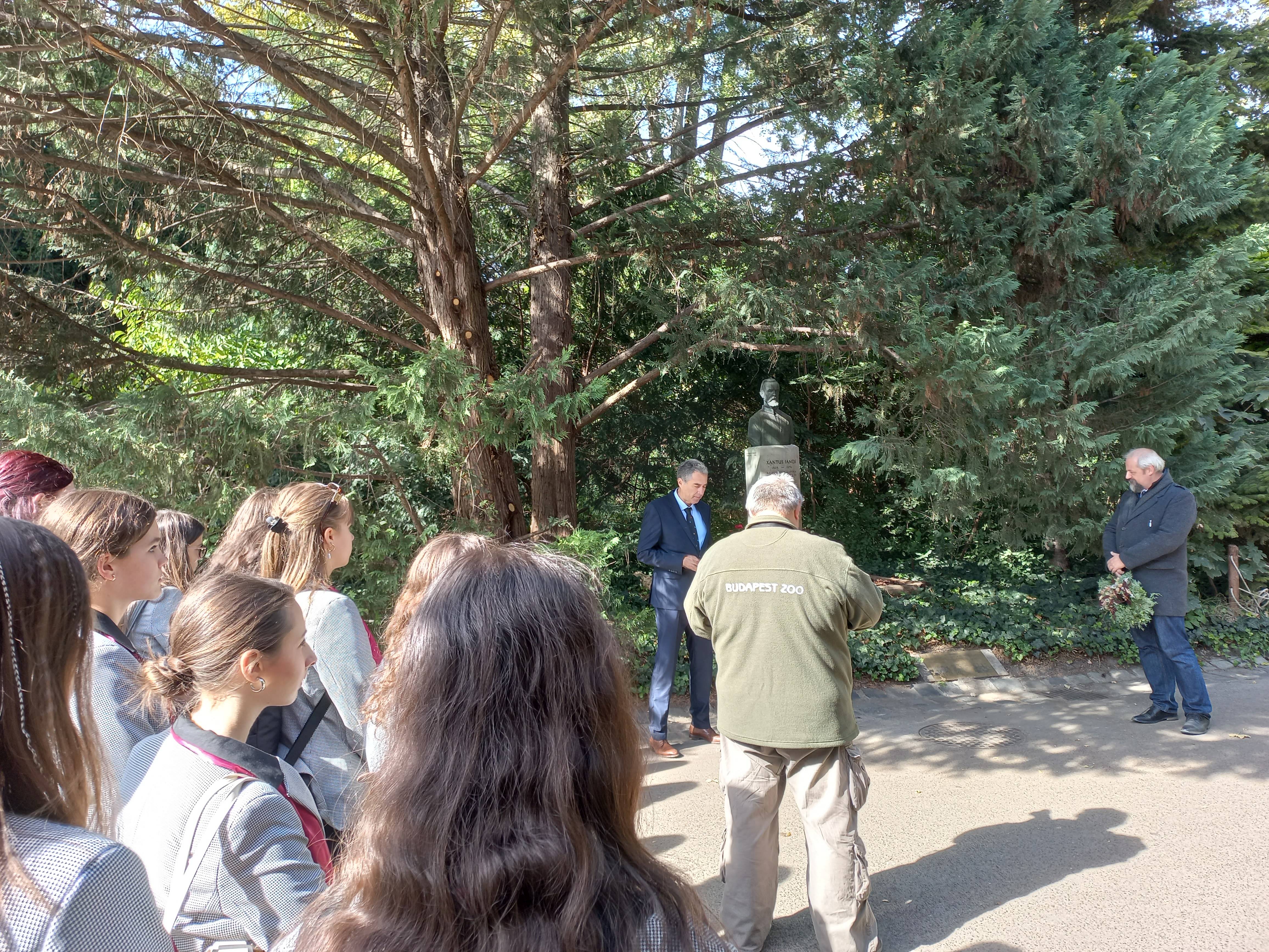 Ugyanezen a napon a Fővárosi Állat-és Növénykertben a 9.C osztály 2. csoportja koszorúzta meg Xántus János szobrát Kovács Dóra Tanárnő kíséretében. A rövid ceremónia során főigazgató úr itt is megható szavakkal illette az ünnepelt tudóst, majd elhelyezésre került mind az Állatkert, mind Iskolánk gyönyörű koszorúja. A megemlékezés után a fiatalok főigazgató úrtól lehetőséget kaptak egy ajándék állatkerti sétára, mely azért is igen kellemes meglepetés volt, hiszen gyönyörű őszi napsütésben volt részük.