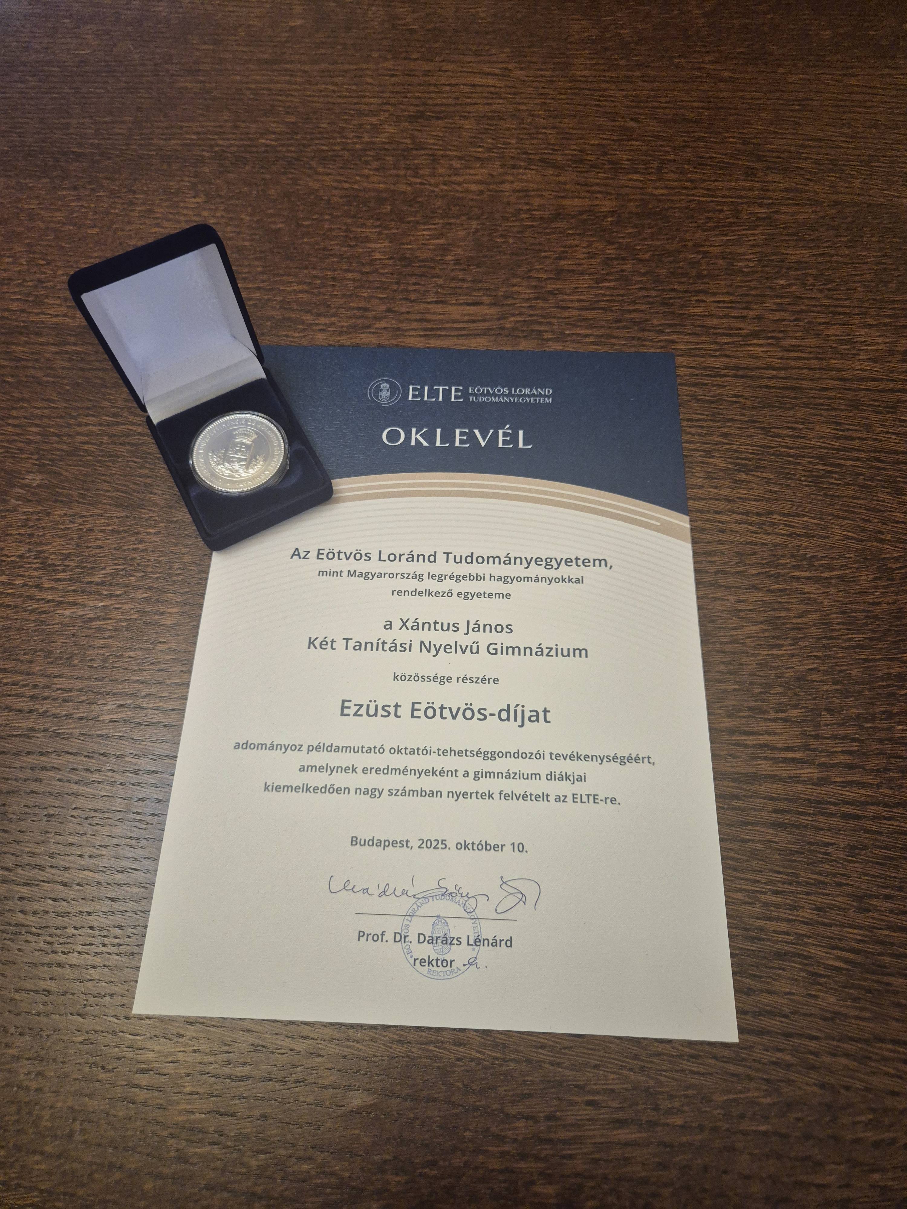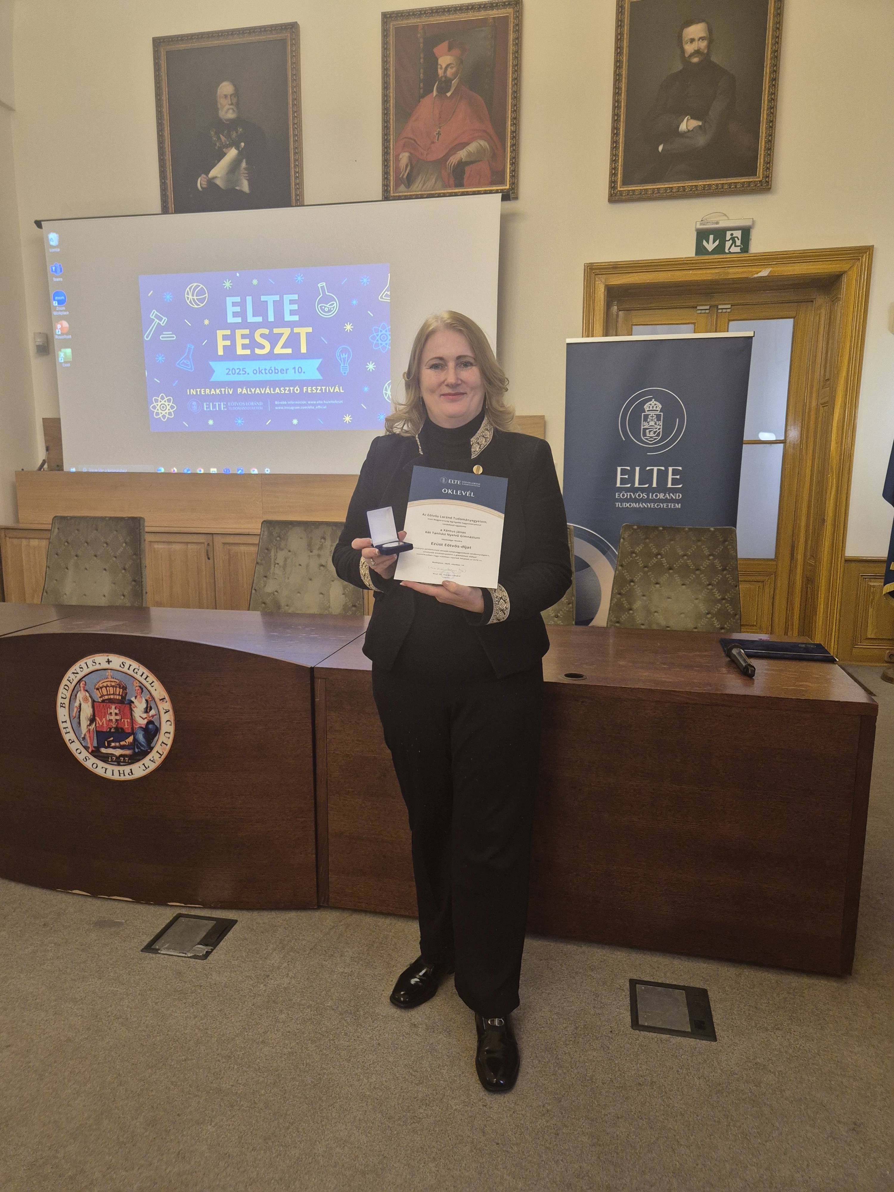 Az eseményen dr. Fehérvizi Judit igazgató asszony átvette az Ezüst Eötvös-díjat, amelyet az iskola példamutató oktatói és tehetséggondozói tevékenységéért ítélt oda az egyetem. Az elismerés annak köszönhető, hogy a 2024–2025-ös tanév felsőoktatási felvételi eljárása során az ELTE-n elsőévesként tanuló hallgatók közül összesen 93 fő a Xántusban érettségizett. Ez a kiemelkedő nagy arány egyben azt is jelenti, hogy gimnáziumunk a felvett hallgatók számában országos 1. helyezést ért el.