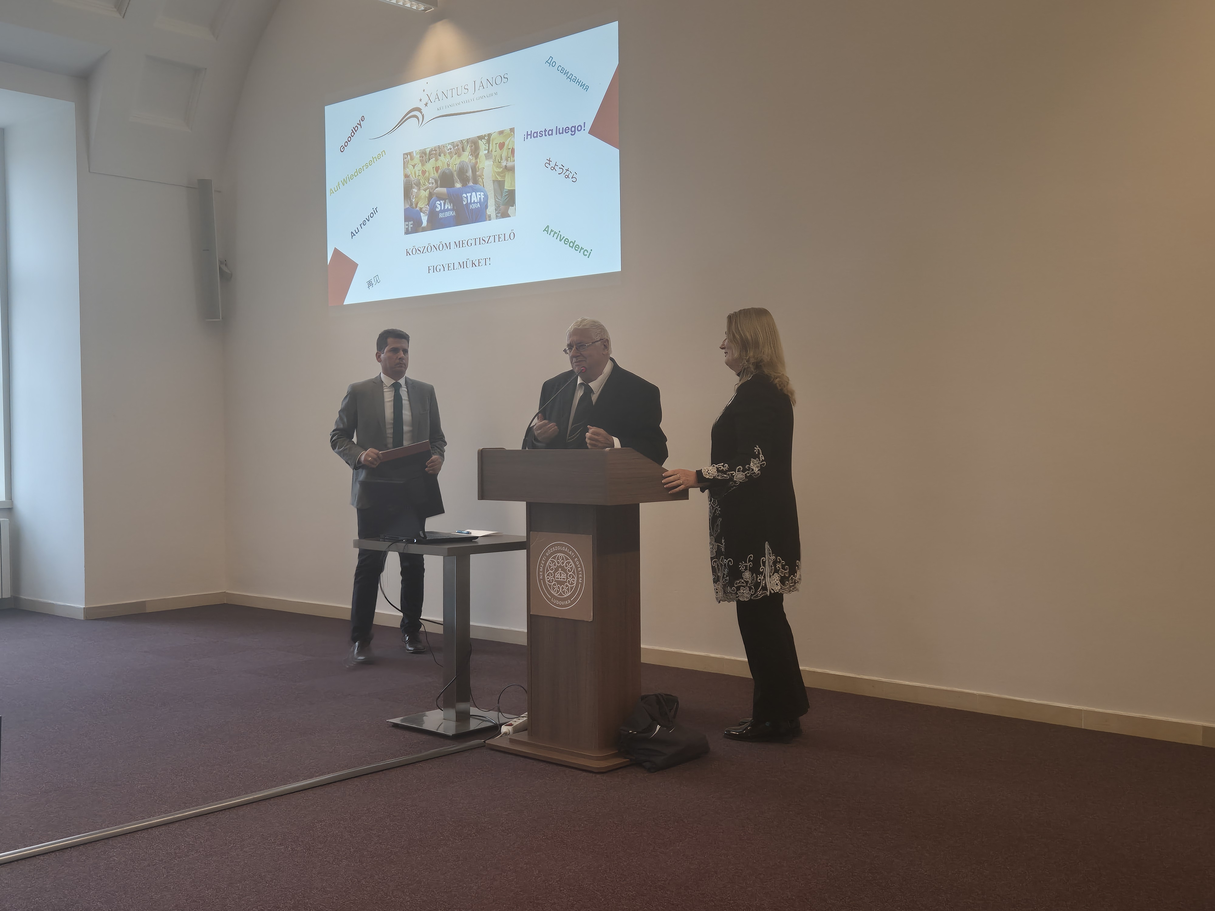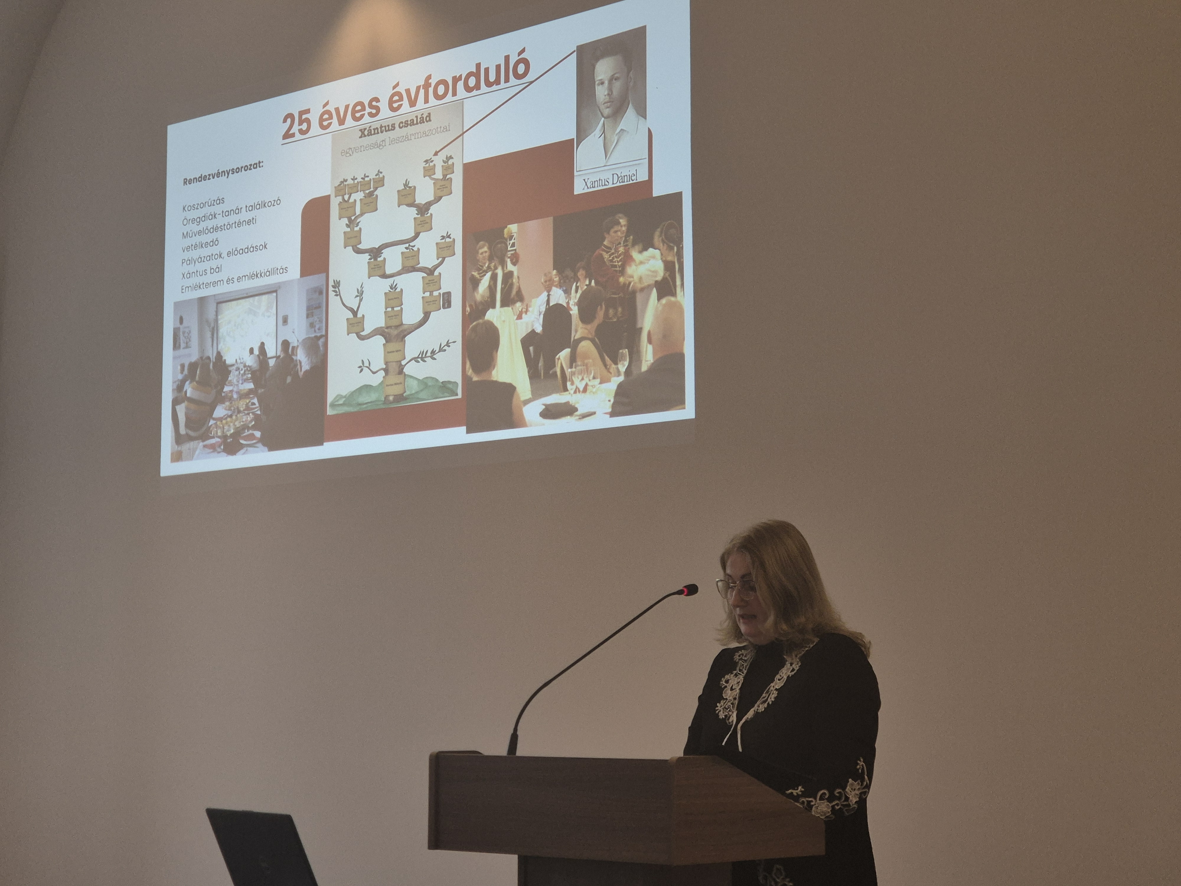 Az előadás középpontjában a gimnázium 35 éves fennállása, valamint Xántus János születésének 200. évfordulója állt. Igazgató asszony bemutatta, hogyan vált a Xántus az évek során kiemelkedő két tanítási nyelvű intézménnyé, ahol a magas szintű szakmai munka mellett mindig fontos szerepet kapott az érték- és hagyományápolás.